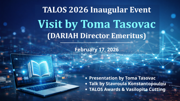 Το Εργαστήριο ΤΑΛΩΣ εγκαινιάζει τις δράσεις του για το 2026 την Τρίτη 17 Φεβρουαρίου στην Αίθουσα Συσκέψεων του εργαστηρίου (Γραφείο Γ3, Κτίριο Γ, ΚΕΜΕ-ΠΚ, Ρέθυμνο) και διαδικτυακά μέσω Zoom, με προσκεκλημένο και κεντρικό ομιλητή τον Δρ. Toma Tasovac, Επίτιμο Διευθυντή της πανευρωπαϊκής ερευνητικής υποδομής που υποστηρίζει την ψηφιακή έρευνα στις Τέχνες και τις Ανθρωπιστικές Επιστήμες, DARIAH ERIC (Digital Research Infrastructure for the Arts and Humanities – European Research Infrastructure Consortium), ο οποίος θα πραγματοποιήσει ομιλία με τίτλο "Infrastructures as Public Goods in an Age of Algorithmic Confidence".