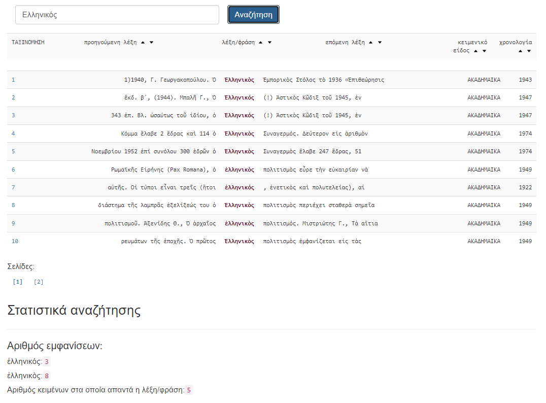 The first research efforts in the Diachronic corpus of Greek of the 20th century offer valuable data for an overview of the history of our language. For example, they show that the idea of contrast between katharevousa and demotic is rather simplistic and that we have to distinguish between conservative, on the one hand, and innovative, on the other hand, textual genres (e.g. academic texts and literature, respectively), which are placed at one of the two poles of social bilingualism, and textual genres that either show little variety (film dialogue) on the one hand, or show a wide range of variety (letters) on the other. Therefore, we cannot talk about an absolute dichotomy of katharevousa and demotic in the linguistic practices of speakers, as we can see in their perceptions of language. However, much remains to be studied: the emergence and prevalence of new greek words ("στοχεύω" versus "σκοπεύω"), or conversely the disappearance of older forms ("διά"), as well as various changes in linguistic means of evaluation, how "έκτακτα" or "περίφημα" give way to "υπέροχα" and "τέλεια", or how the transition from classical culture to classical phobia is being made.